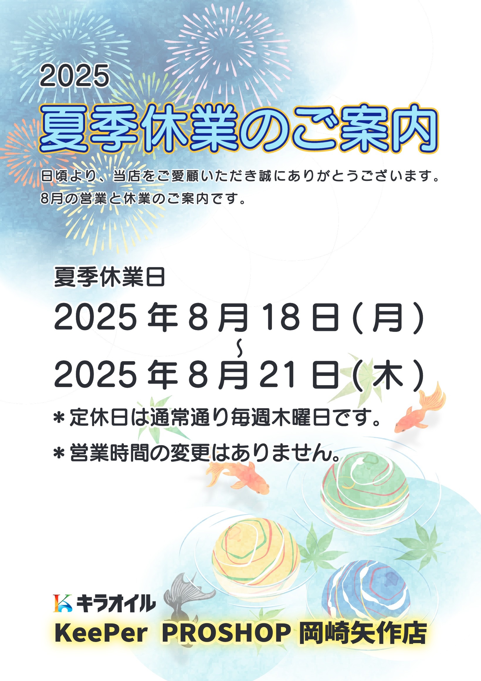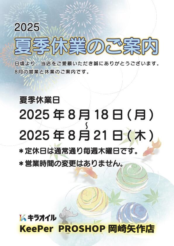 2025.08.04 KeePerPROSHOP岡崎矢作店【夏季休業のお知らせ】 岡崎矢作店 夏季休業のお知らせです。 8/18(月)〜8/21(木)臨時休業させていただきます。 8/22(金)より通常営業いたします。 よろしくお願いいたします。